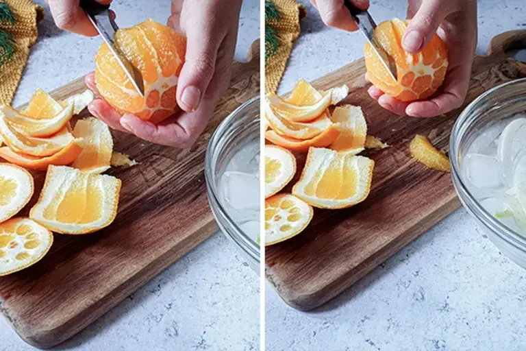 Con un piccolo spelucchino affilato incidete i singoli spicchi prima da un lato e poi dall’altro. Otterrete così spicchi di polpa completamente privi di filamenti.