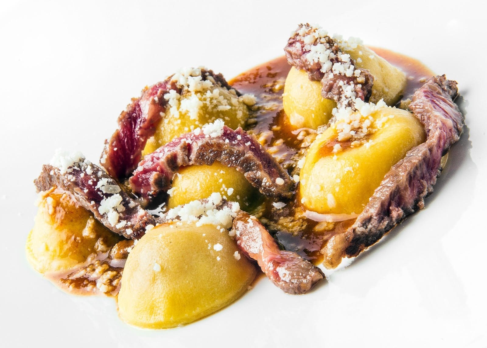 Impastare insieme tutti gli ingredienti. Lasciare riposare per 30 minuti in frigorifero. Stendere la pasta con la sfogliatrice. Spennellare metà della sfoglia con tuorlo di uovo, farcire con i bottoni di pane al “tuco”, coprire il ripieno con il resto della sfoglia di pasta. Tirare via la maggior quantità di aria, chiudere e coppare con il coppapasta della misura appropriata.