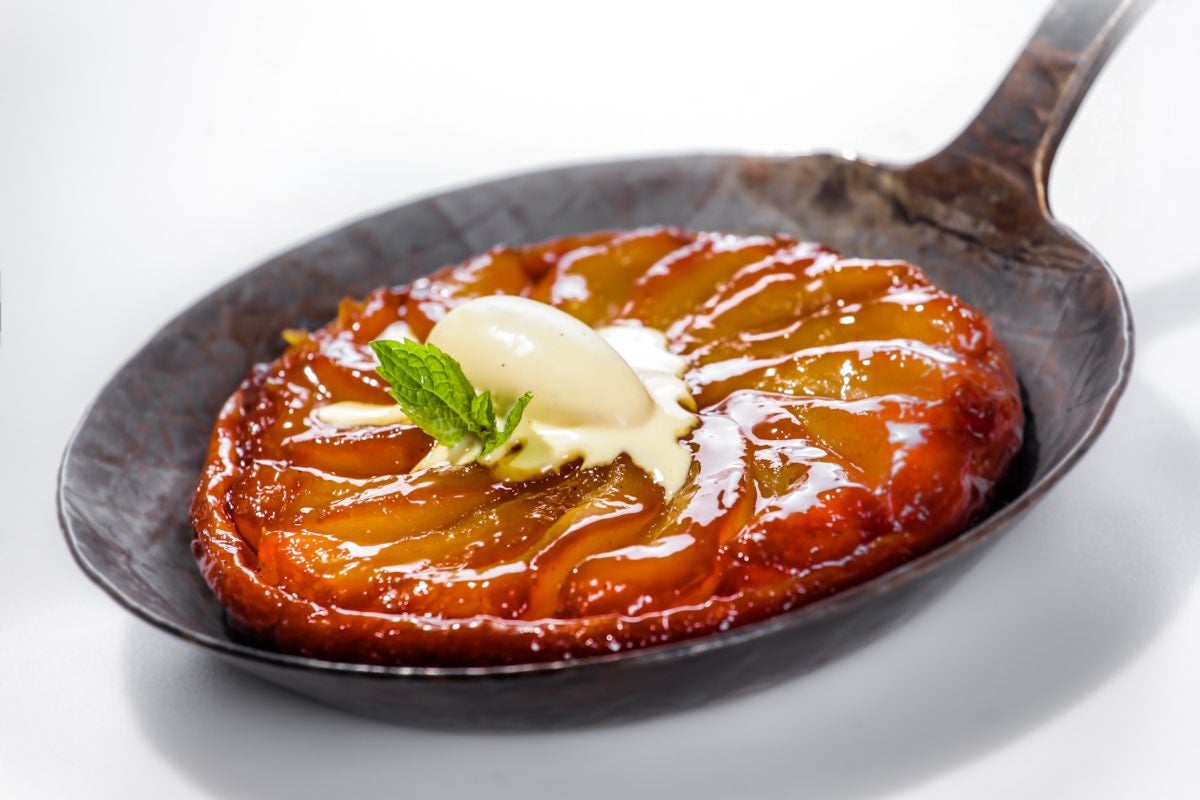 Rovesciare la Tarte Tatin su un tagliere, tagliarla a fette e rimetterla nel suo pentolino caldo. Presentarla, accompagnandola con gelato alla vaniglia.
