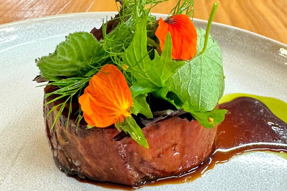 Lingua di manzo al bbq, salsa teriyaki alla grappa di camomilla, insalatina selvatica