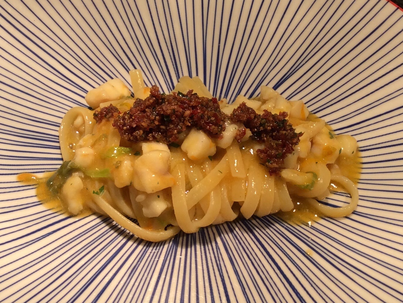 Linguine con scorfano marinato al limone, fiori di zucca e bottarga aromatizzata: la ricetta di Giuseppe Aversa