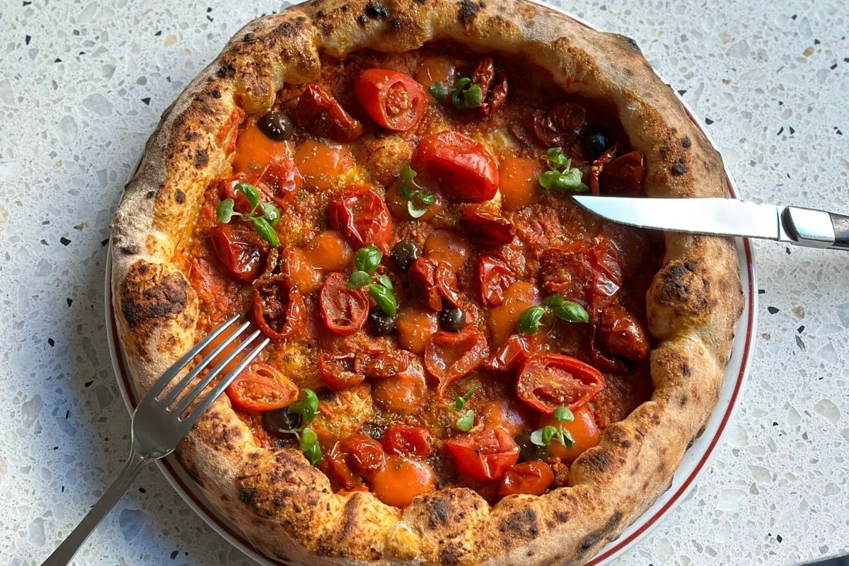 Una volta che l'impasto è pronto, procedere con la farcitura: stendere la crema di datterino arrosto, aggiungere i pomodorini del Piennolo, i ciliegini semi dry, la riduzione di San Marzano e terminare con crema di aglio nero fermentato, origano, basilico baby e olio. Procedere con la cottura (un minuto e mezzo a 450°C oppure a 250°C per massimo 7-8 minuti).