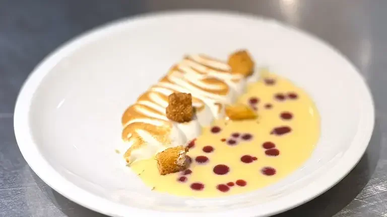 Ora assembla il dolce. Metti la meringa su un lato del piatto e bruciala leggermente in superficie con un cannello. Versa un paio di cucchiai di crema pasticcera al lato e decorala con dei puntini di coulis ai frutti rossi. Aggiungi il pandoro croccante e servi.