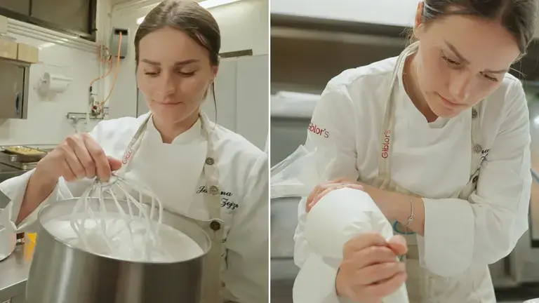Quando lo sciroppo è a temperatura, alza la velocità della planetaria e versa lo sciroppo a filo sugli albumi, facendolo scivolare lungo la parete della ciotola per evitare schizzi.