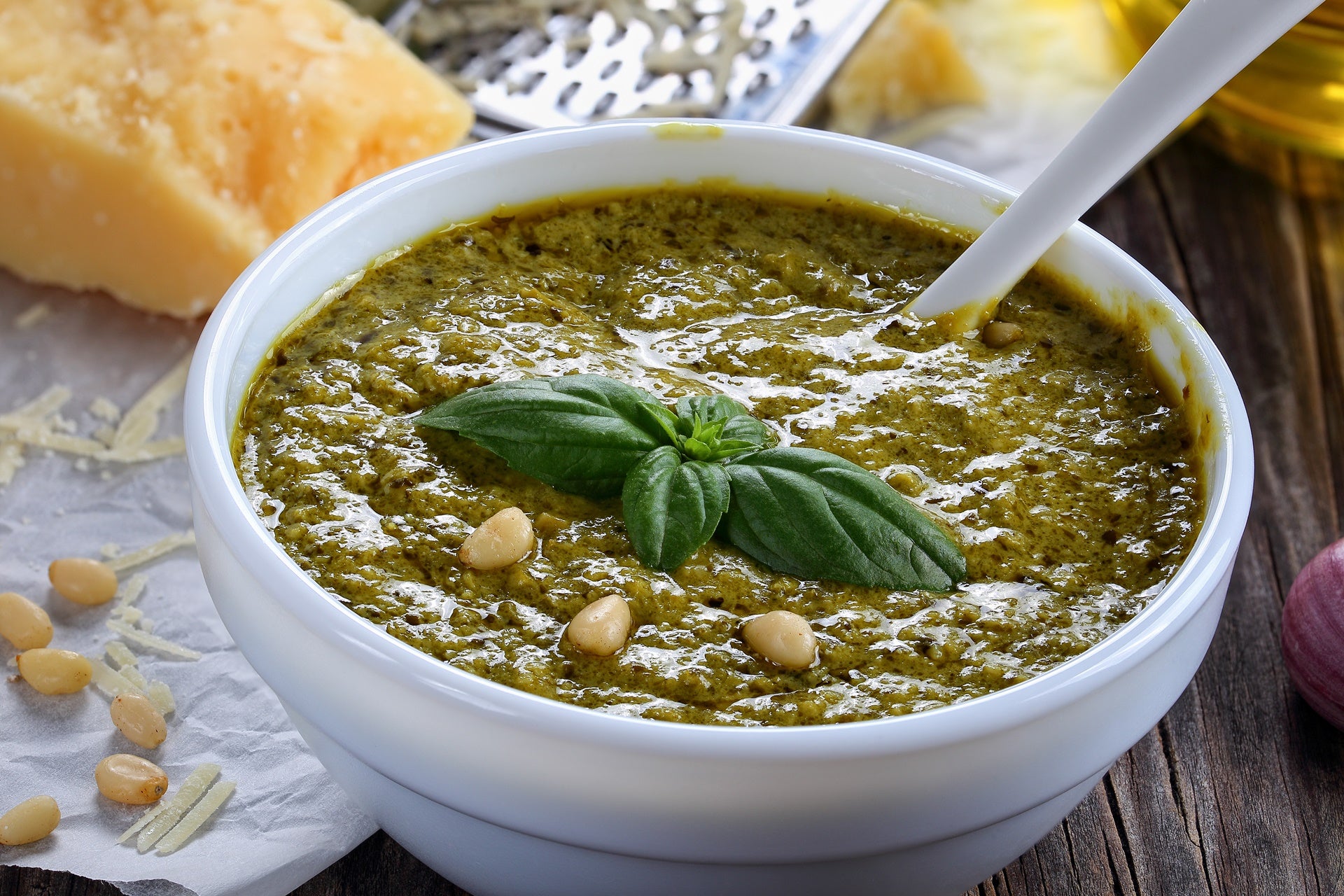 Quando il minestrone sarà pronto, servitelo con il pesto alla genovese, i pinoli tostati e un filo d’olio a crudo.