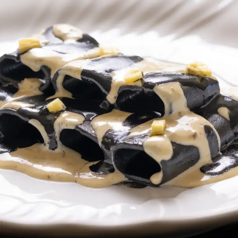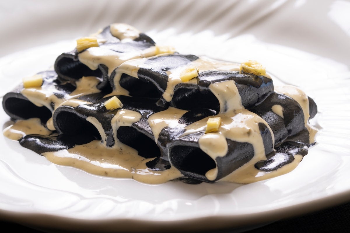 Pacchero al carbone vegetale, crema di cacio e limone bruciato: la ricetta di Giacomo Devoto