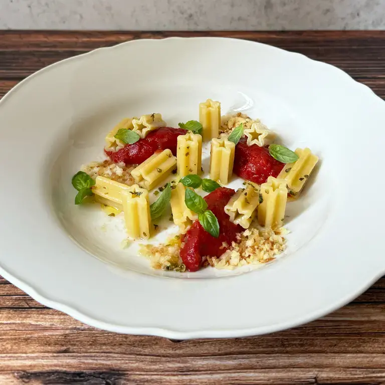 Servite guarnendo la pasta con un rombo di tartare di pomodori confit precedentemente condito con olio e fior di sale, completate il piatto con il jus di pomodoro, l’umami, il pane tostato e decorate il tutto con una bella cimetta di basilico.