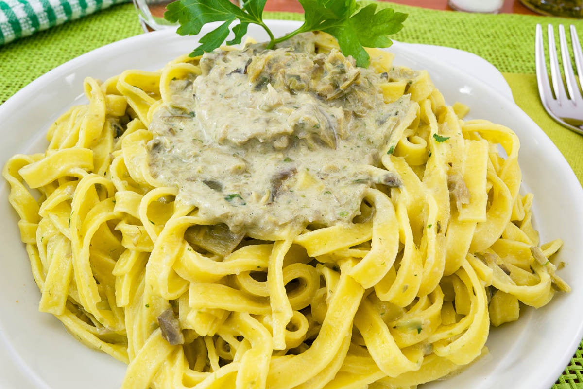 La pasta con crema di carciofi è un primo piatto perfetto per la stagione invernale, da gustare nella sua versione vegetariana o con aggiunta di pancetta.
