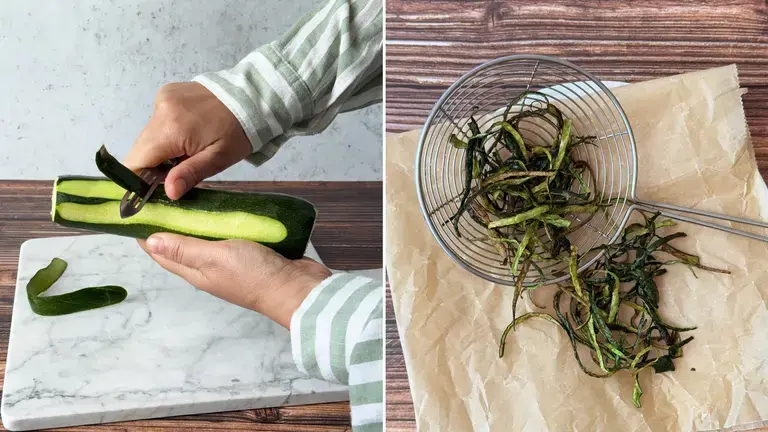 Pela le zucchine. Taglia la parte verde a julienne molto sottile, friggila in olio a 170°C finché non diventa dorata e mettila da parte. Taglia la parte bianca a piccoli pezzi e cuocila in una pentola con un filo d’olio e un pizzico di sale. Copri con un coperchio e lascia cuocere lentamente fino a completa cottura. Togli il coperchio e fai asciugare a fiamma viva. Poi frulla fino a ottenere una crema liscia.
