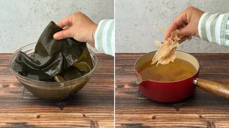 La sera prima, metti l’alga kombu in una pentola con 1,5 litri di acqua e lasciala in infusione per tutta la notte. La mattina successiva, porta il liquido a 60°C, rimuovi l’alga kombu, poi porta a 70°C e aggiungi il katsuobushi. Lascia che il katsuobushi affondi naturalmente, quindi filtra il brodo.