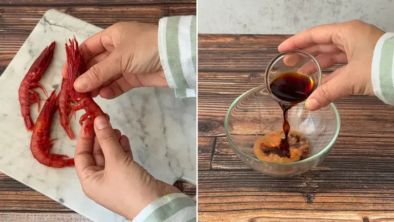 Pulisci il gambero rosso, taglialo a tartare e condiscilo con un pizzico di sale, olio extravergine e zest di limone. Con l’aiuto di pollice e indice, schiaccia la testa del gambero e raccogli i succhi in una ciotolina con un goccio di salsa di soia, mescolando delicatamente.