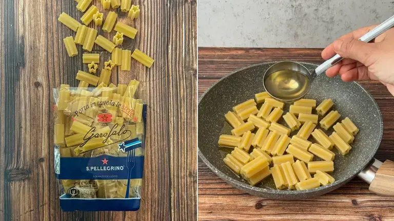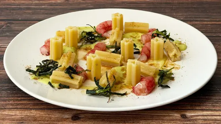 Pasta fredda con zucchine, dashi, gambero rosso e polvere di miso bianco
