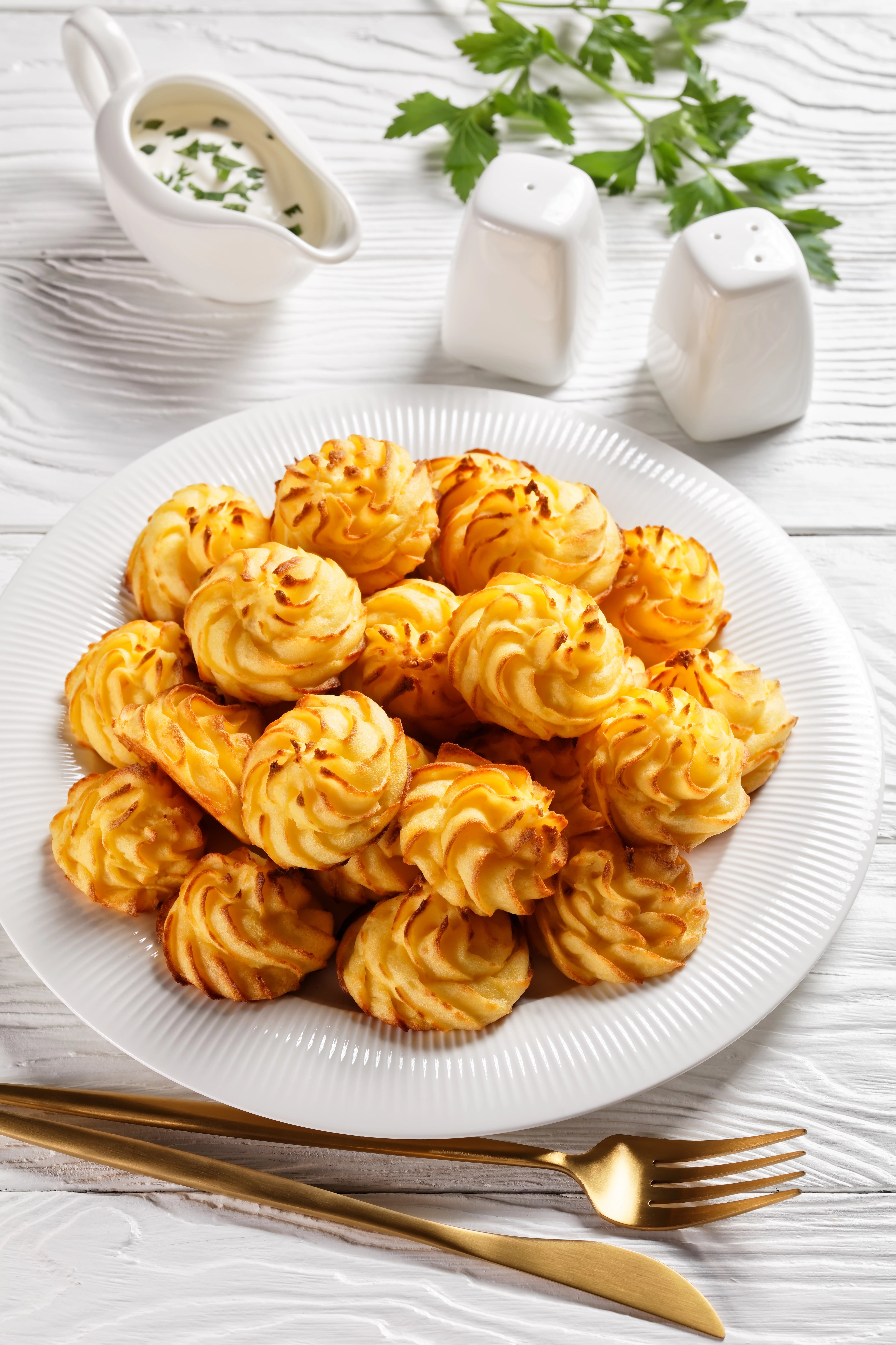 Per un servizio elegante, le patate duchessa possono essere preparate in formato mignon da usare come garnish su piatti di carne o pesce, oppure in ciuffi leggermente più grandi per accompagnare arrosti e piatti importanti.