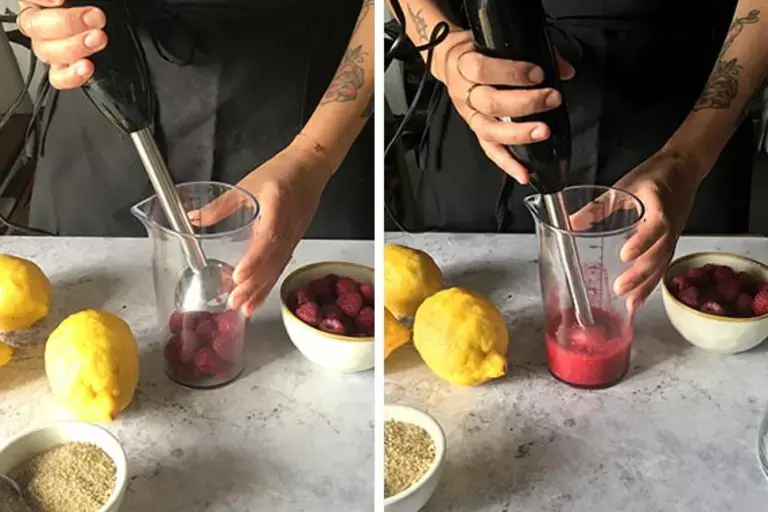 Per preparare la pink lemonade cominciate frullando i lamponi. Metteteli nel bicchiere del mixer, dopo averli lavati, e frullateli fino ad ottenere un composto omogeneo.
