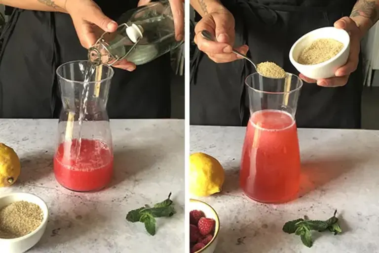 Mettete il succo di limoni insieme ai lamponi. Aggiungete poi l’acqua e mescolate delicatamente.