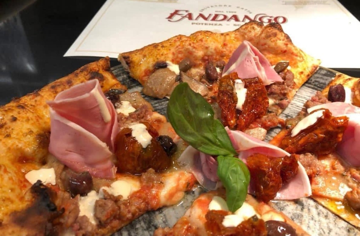 All'uscita dal forno, finire con prosciutto cotto di maiale nero lucano, olive infornate di Ferrandina, fonduta di pecorino di Filiano Dop, pomodori semi dry e qualche foglia di basilico fresca.
