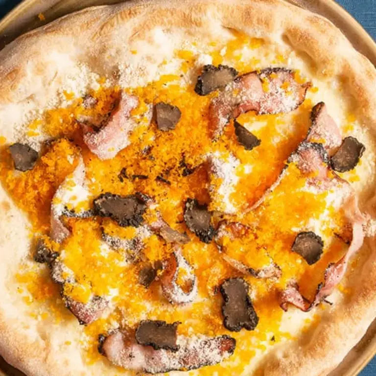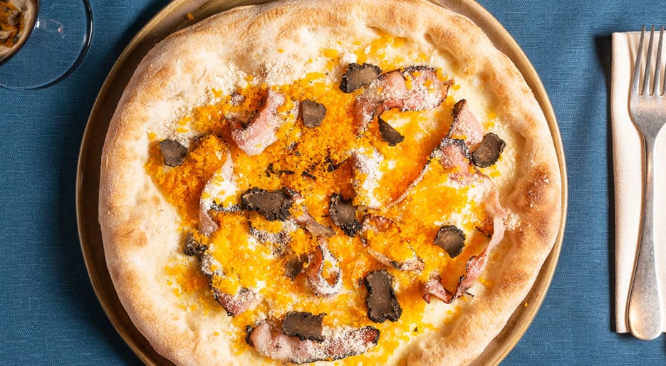Una dei più classici sughi italiana della pasta diventa il topping perfetto nella pizza di Daniele Donatelli. Con l'aggiunta del tartufo nero.