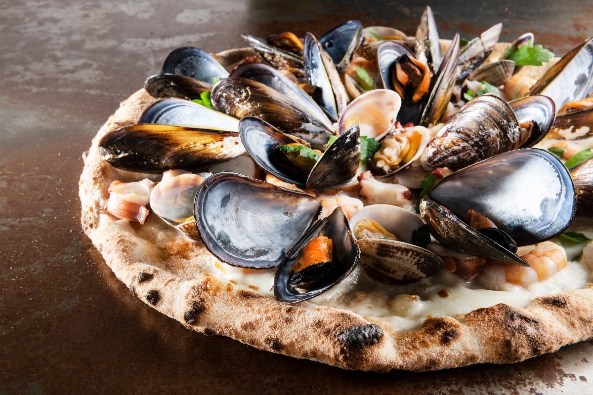 Raggiunta l’altezza gradita, infornare il tutto (temperatura al massimo, 240°C in maniera statica). Quando si accende il forno, il consiglio è di mettere, nella parte sottostante, un piccolo pentolino di acqua tiepida, per creare all’interno della camera l’umidità ideale per la pizza. Quando si inforna la pizza, per i primi minuti, posizionarla nella parte inferiore del forno (dove si mette il pentolino): dopo due minuti, tirarla fuori dal forno e aggiungere la metà del tarallo su ogni pizza e la mozzarella. Infornare la pizza per altri due minuti, aggiungere le code di gambero, infornare la pizza per altri due minuti, aggiungere il polpo e cuocere per altri due minuti, quindi aggiungere le cozze e le vongole, in precedenza fatte aprire in padella. Cuocere per due minuti, quindi sfornare la pizza. A cottura ultimata, aggiungere del restante tarallo, l'olio piccantino o russ e Napoli, infine il prezzemolo (i tempi di cottura possono variare a seconda del modello di forno).
