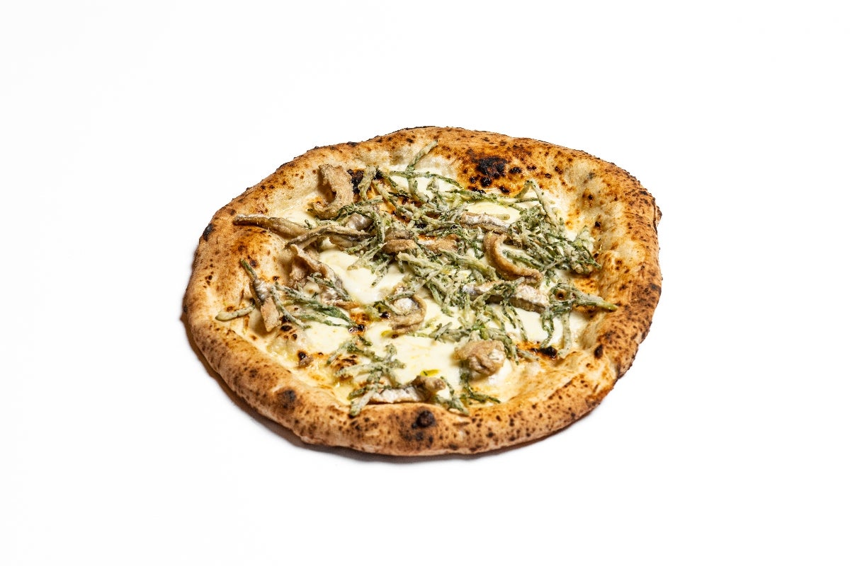 Per l'assemblaggio finale: distribuite le alici fritte e la salicornia fritta sulla pizza appena sfornata. Completate con una grattugiata leggera di zest di limone per un tocco di freschezza.