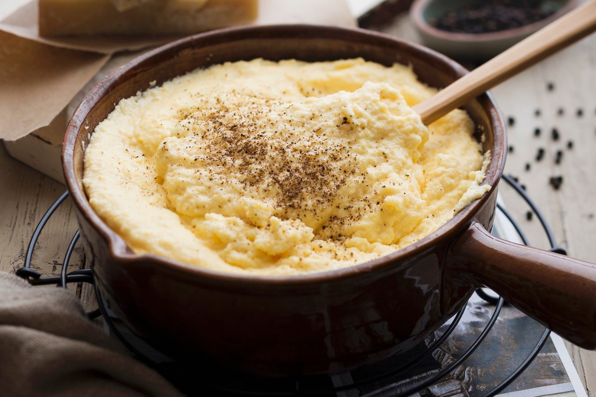 Versate il burro fuso al centro dell’incavo e servite la vostra polenta concia ben calda con una spolverata di pepe.