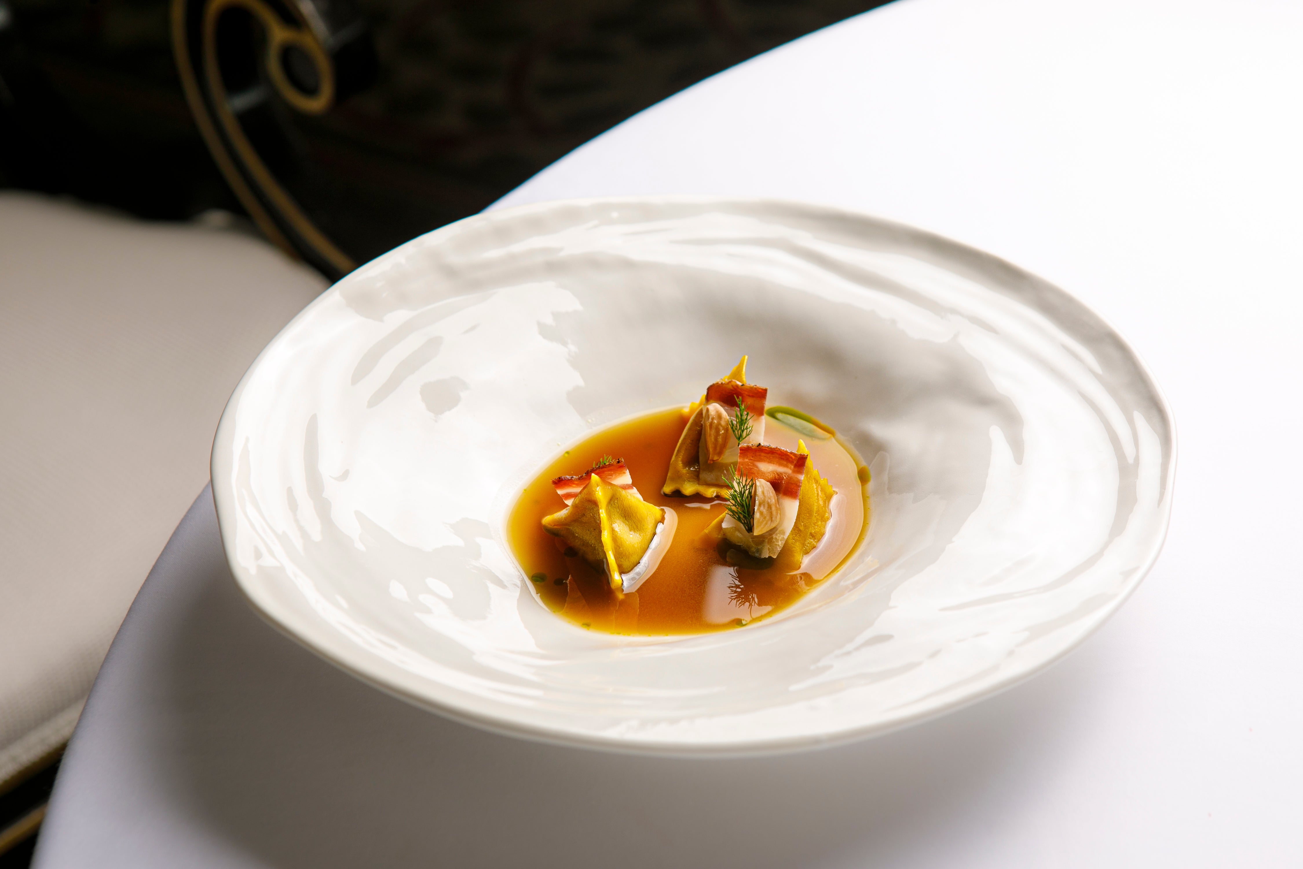Il piatto Raviolo di granchio, pancetta e mandorle rappresenta al meglio l'equilibrio tra mare e montagna.