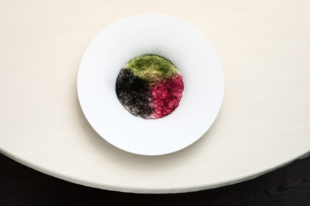 Lavate accuratamente il prezzemolo, sbollentatelo in acqua bollente salata, quindi raffreddatelo in acqua e ghiaccio. Stendetelo su una placca e essiccatelo nell’essiccatore a 47°C per 24 ore. Frullate il tutto, passate al setaccio fine e, infine, aggiungete la quantità necessaria di plancton.