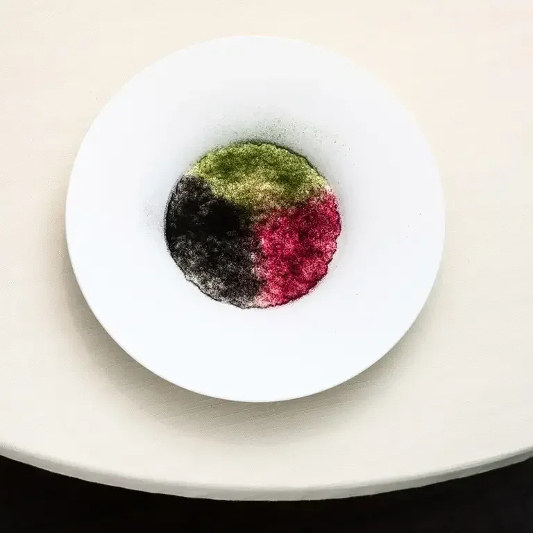 Lavate, pelate e tagliate finemente le patate. Preparate un soffritto con lo spicchio d’aglio, quindi aggiungete le patate, il brodo vegetale e il nero di seppia. Frullate fino a ottenere una crema liscia e omogenea, poi stendetela su una placca e essiccatela a 53°C per 24 ore. Infine, frullate il tutto e passate al setaccio fine.
