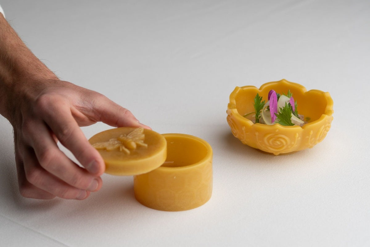 Sciogliete la cera d’api e colatela nello stampo, lasciate raffredare e sformate. Essiccate la rosa e riempitela con polline alle erbe. Mettete la crioestrazione nella salsiera.