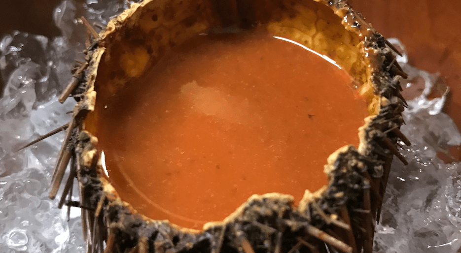 Il sapore del riccio di mare viene valorizzato da una crema saporita in questa ricetta creativa dello chef.