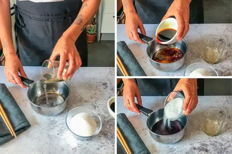 Per preparare la salsa Eel, cominciate mettendo in un pentolino la salsa di soia, lo zucchero e il mirin.