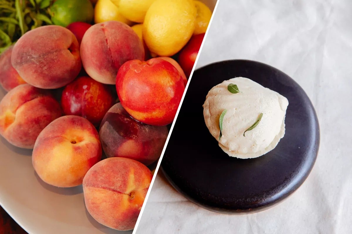 Questa ricetta è di Dominique Crenn (di Atelier Crenn e Petit Crenn a San Francisco), la prima chef donna con tre stelle Michelin negli Stati Uniti, che utilizza le pesche troppo mature della sua dispensa per realizzare questa ricetta deliziosa e creativa.