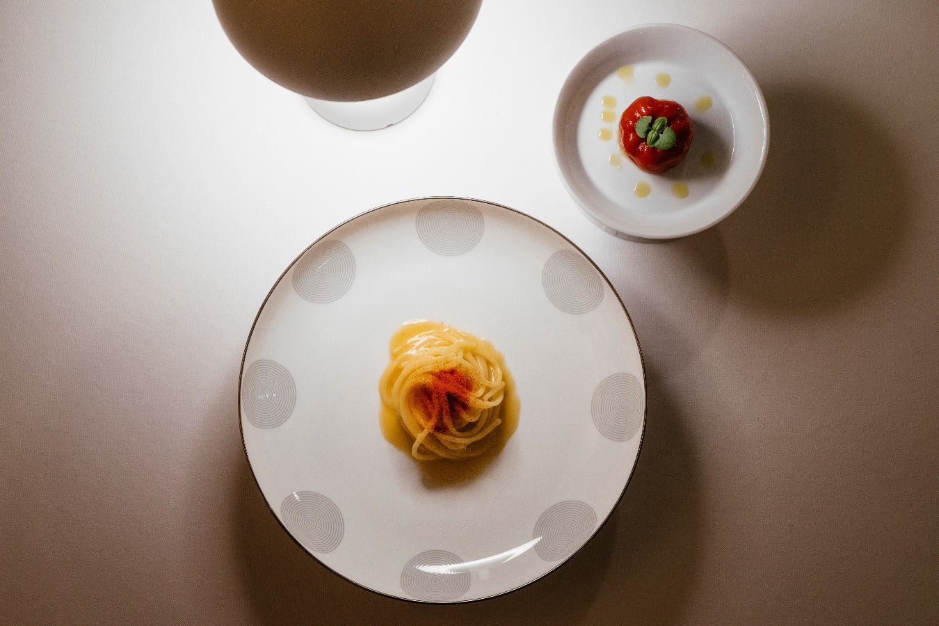 Cuoci gli spaghetti in abbondante acqua salata, portali a metà cottura, scolali e finisci la cottura in padella con acqua di pomodoro. Manteca gli spaghetti con una piccola noce di burro, olio evo e olio di aglio. Una volta che la consistenza dell’acqua sarà mielosa, spegni il fuoco e finisci con una spolverata di Parmigiano Reggiano.