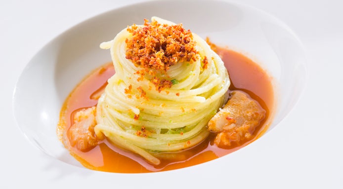 Spaghettino aglio, olio e peperoncino in guazzetto di granchio: una gustosa ricetta di Fabio Abbattista, giovane chef pugliese dell'Albereta in Franciacorta.