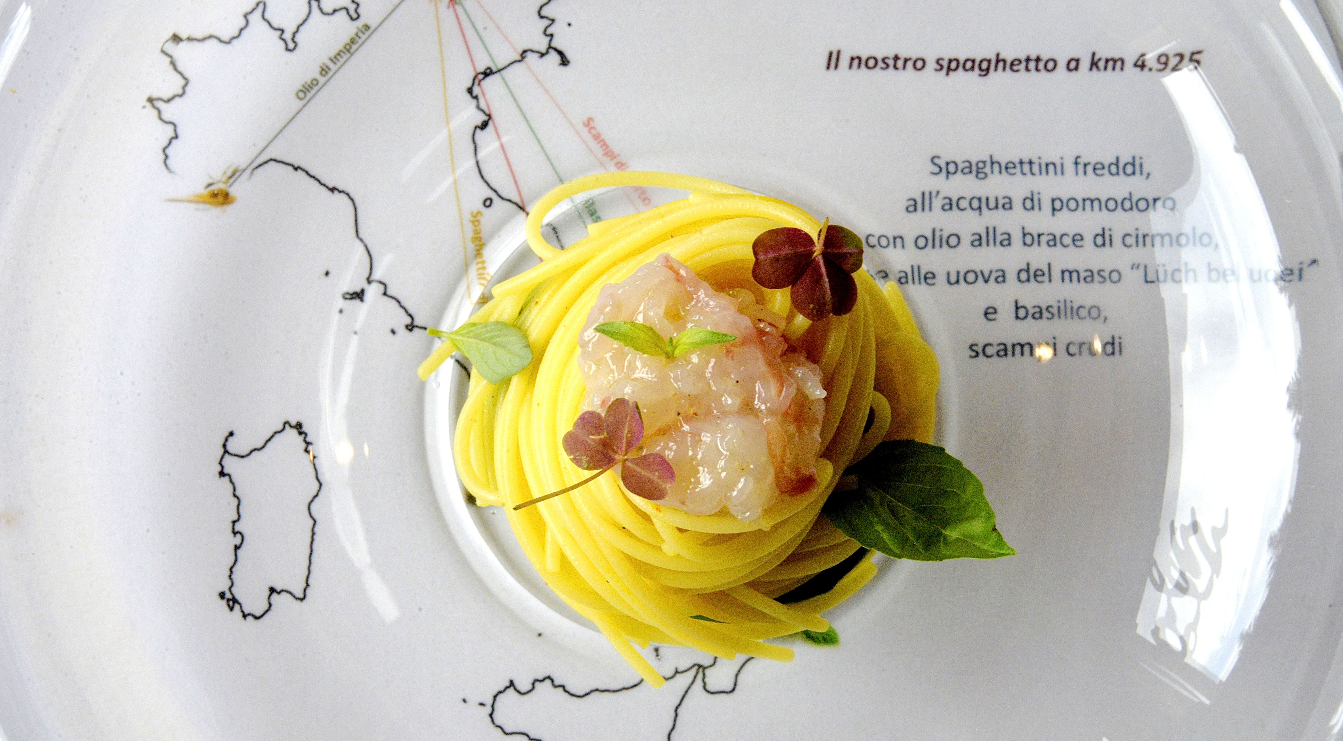 Gli spaghetti freddi secondo Matteo Metullio: un piatto servito con una cartina dell'Italia dove lo chef spiega da dove vengono tutti gli ingredienti.