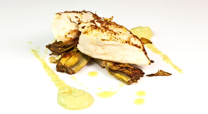 Prendere il piatto e fare una striscia di salsa di carciofi, adagiare i carciofi saltati in padella, il trancio di spigola, un filo d'olio e le chips di carciofi.