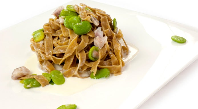 Una ricetta con le tagliatelle fatte in casa, con lavarello, liquirizia, fave e crema di burrata della chef Sara Preceruti.