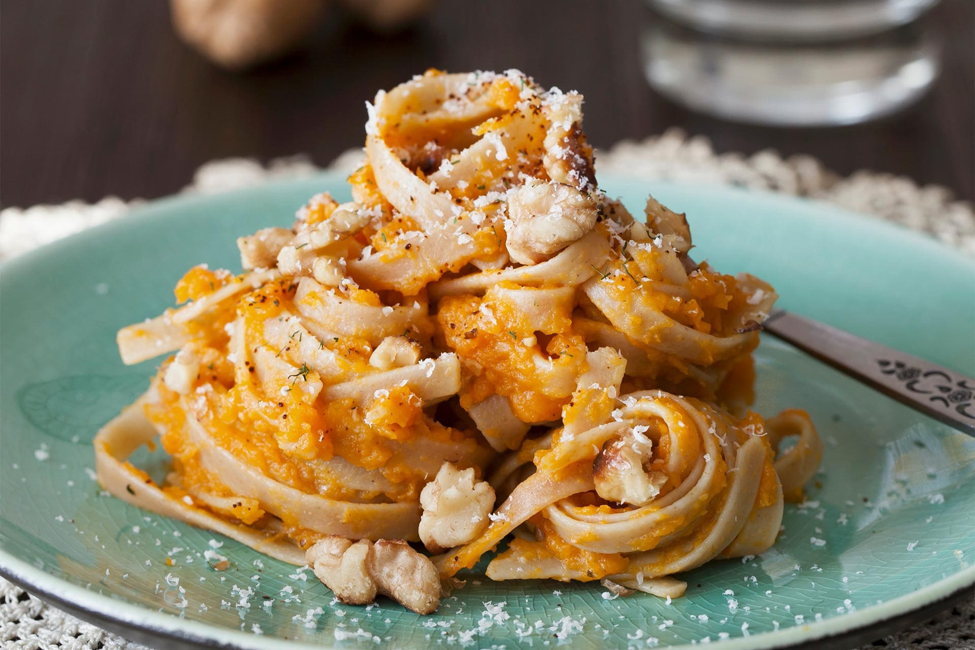 La pasta con noci e zucca è una ricetta autunnale facile quanto gustosa. Qui vi proponiamo una versione con tagliatelle, noci tostate e crema di zucca: ecco come si prepara questo primo piatto vegetariano dal sapore delicato.