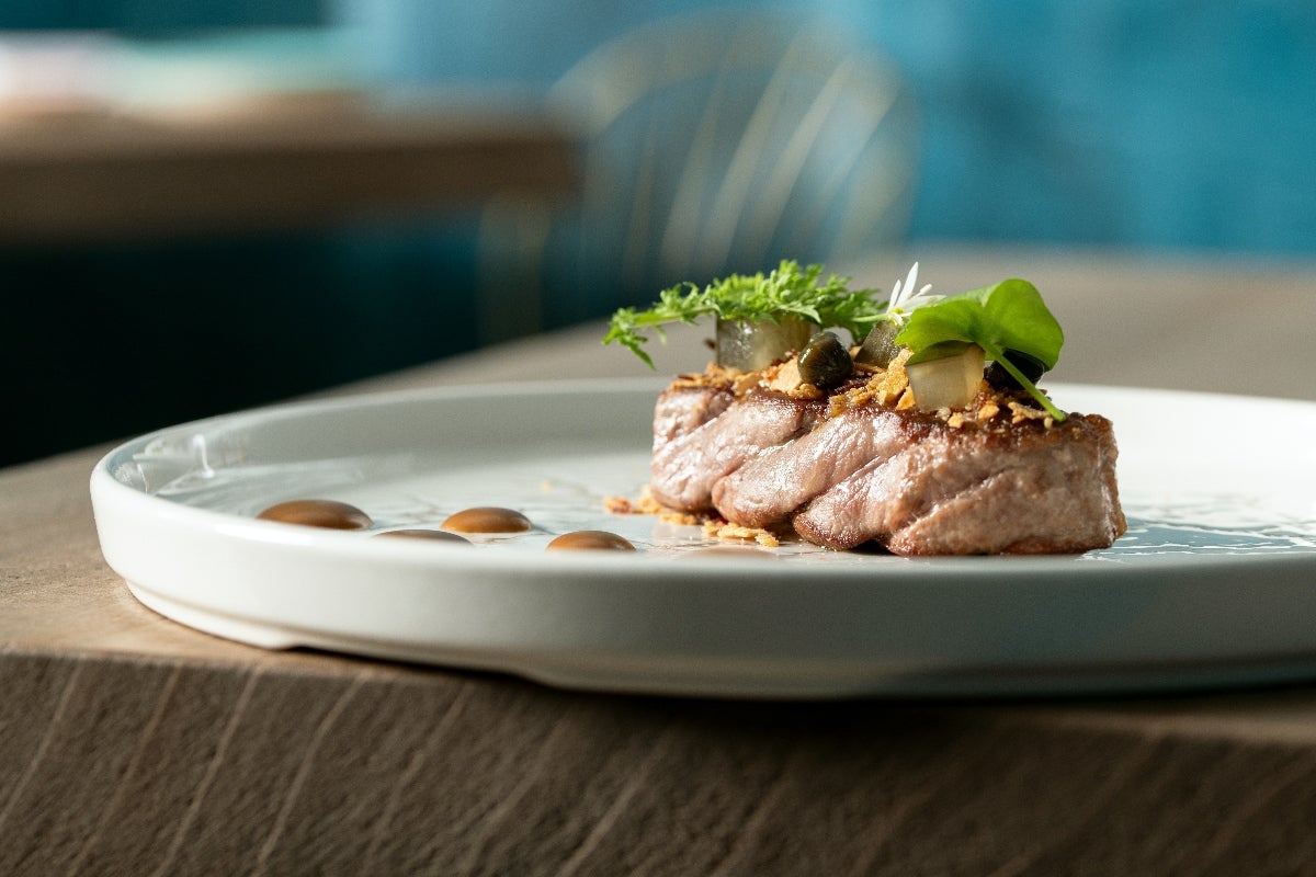 Tataki di ventresca, capperi canditi, cetrioli marinati e croccante di pane guttiau