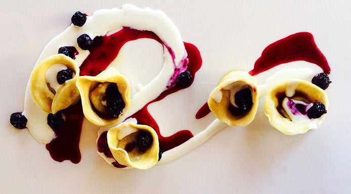 Tortelli di Kamut ripieni d'anatra ai rosmarina con crema di Raschera DOP e mirtilli