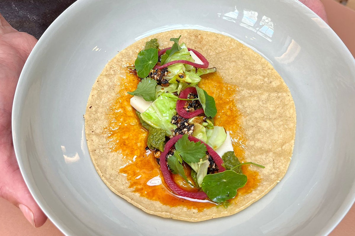 Tortilla di mais con gambi di cavolfiore arrosto speziati, crema di broccoli fermentati, salsa matcha e sottaceti