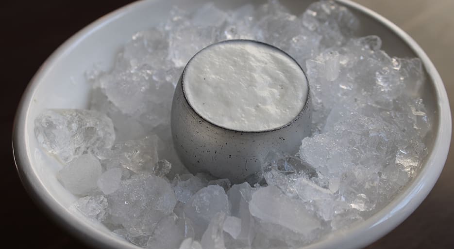 Un dessert firmato da Isabella Potì. Un dolce stratificato racchiuso in un ovetto metallico freddissimo.