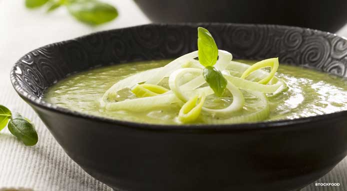 - Servite la vellutata di zucchine, patate e porri con una guarnizione di anellini di porro e fogliette di basilico.