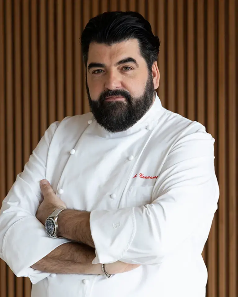Nato il 16 aprile 1975 a Vico Equense, in provincia di Napoli, Antonino Cannavacciuolo, si appassiona alla cucina sin da bambino, osservando la nonna ai fornelli. Figlio di un cuoco, sceglie di seguire le orme del padre, nonostante i suoi tentativi di dissuaderlo. Si iscrive così all'Istituto Alberghiero I.S.I.S. De Gennaro e inizia a fare le prime esperienze professionali. La voglia di imparare le basi dell’alta cucina lo porta in Francia, dove lavora in rinomati ristoranti come l'Auberge dell'Ile di Illhaeusern e il Buerehiesel di Strasburgo. Tornato in Italia, entra al Grand Hotel Quisisana di Capri, sotto la consulenza di Gualtiero Marchesi. Ormai esperto di ristorazione alberghiera, lo chef si trasferisce sul Lago d’Orta, dove lavora prima per l’Hotel San Rocco e poi per l’Approdo. Nel 1999, in collaborazione con la moglie Cinzia Primatesta, inizia un’avventura importante: i due prendono la gestione di Villa Crespi, una dimora storica in stile moresco situata sul Lago d’Orta, in Piemonte. Nel giro di pochi anni, il ristorante ottiene successo e riconoscimenti: la prima una stella Michelin arriva nel 2003, seguita dalla seconda nel 2006 e dalla terza nel 2023. Nel 2015 lo chef inaugura il Cannavacciuolo Cafè & Bistrot a Novara, seguito dal Cannavacciuolo Bistrot a Torino aperto nel 2017, entrambi premiati con una stella Michelin nel 2018. Nel 2019, Cannavacciuolo lancia il suo laboratorio di pasticceria artigianale a Suno, in provincia di Novara, e uno shop online per acquistare i suoi prodotti da tutta Italia. Il 2021 segna la realizzazione del progetto LAQUA Resorts, che prevede l’apertura di diversi boutique hotel caratterizzati da un’offerta gastronomica eccellente. Nel 2025, Antonino Cannavacciuolo ha ricevuto il prestigioso Chef Mentor Award della Guida Michelin Ristoranti.