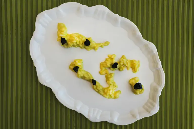 Tra questi, i Rigatoni cacio e pepe, cucinati all’interno di una vescica di maiale, che rappresentano un perfetto incontro tra la tradizione e sperimentazione, e lo Spaghettone burro e lievito di birra, un piatto che esalta l’umami grazie a un uso sapiente di burro e lievito, riducendo tutto alla semplicità di tre ingredienti, una preparazione che è stata esposta al MoMA di New York nel 2016. Un altro esempio di un suo piatto signature ancora presente in menù è il Riso aglio nero e frutti rossi, una creazione avanguardistico che lo chef ha ideato nel 2014 per una mostra d’arte moderna al Lido 84, in omaggio allo scultore Stefano Bombardieri.